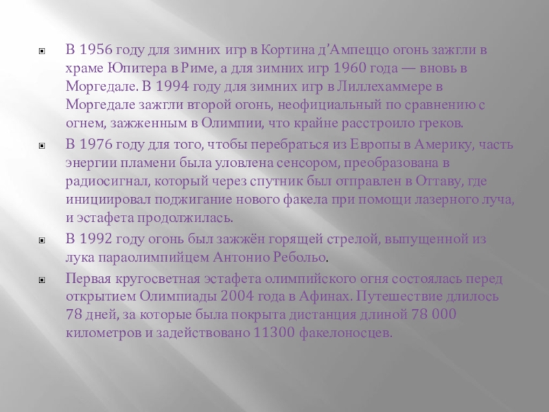 в храме Юпитера в Риме, а для зимних игр 1960 года — вновь в Моргедале. В 1994 году для зимних игр в Лиллехаммере в Моргедале зажгли второй огонь, неофициальный по сравнению с огнем, зажженным в Олимпии, что крайне расстроило греков.