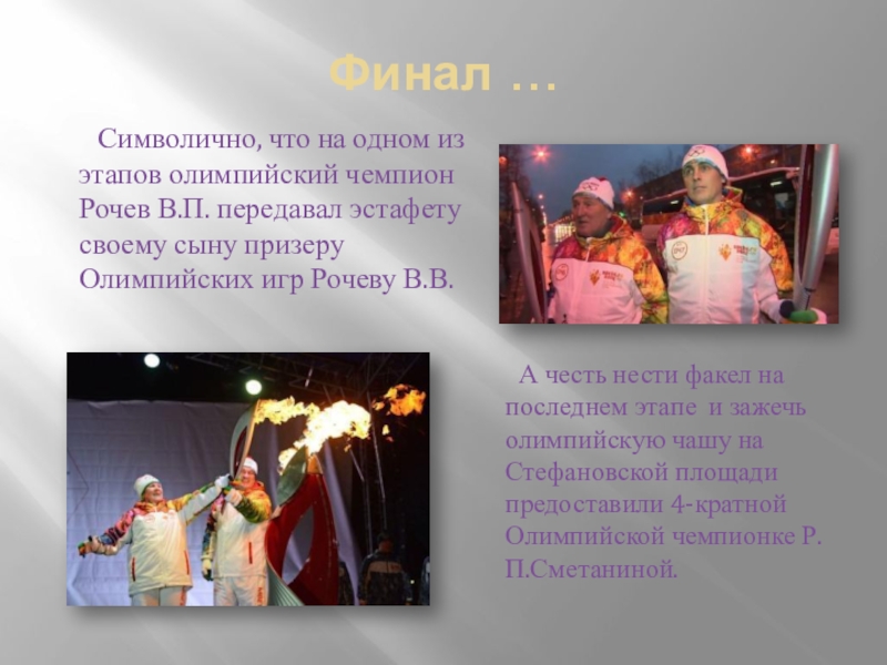 этапов олимпийский чемпион Рочев В.П. передавал эстафету своему сыну призеру Олимпийских игр Рочеву В.В.