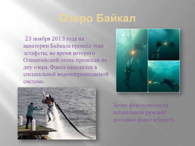 Байкала прошёл этап эстафеты, во время которого Олимпийский огонь пронесли по дну озера. Факел находился в специальной водонепроницаемой системе.