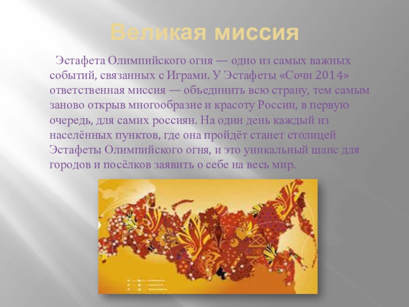 из самых важных событий, связанных с Играми. У Эстафеты «Сочи 2014» ответственная миссия — объединить всю страну, тем самым заново открыв многообразие и красоту России, в первую очередь, для самих россиян. На один день каждый из населённых пунктов, где она пройдёт станет столицей Эстафеты Олимпийского огня, и это уникальный шанс для городов и посёлков заявить о себе на весь мир.
