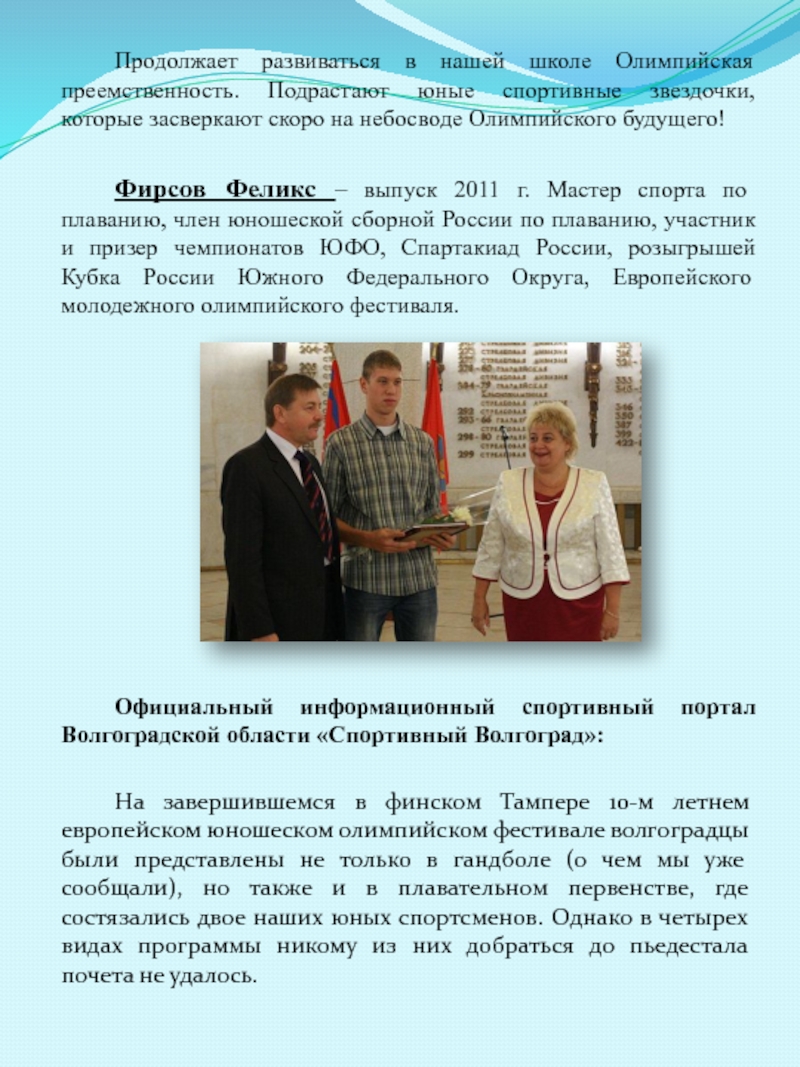 Фирсов Феликс – выпуск 2011 г. Мастер спорта по плаванию, член юношеской сборной России по плаванию, участник и призер чемпионатов ЮФО, Спартакиад России, розыгрышей Кубка России Южного Федерального Округа, Европейского молодежного олимпийского фестиваля.