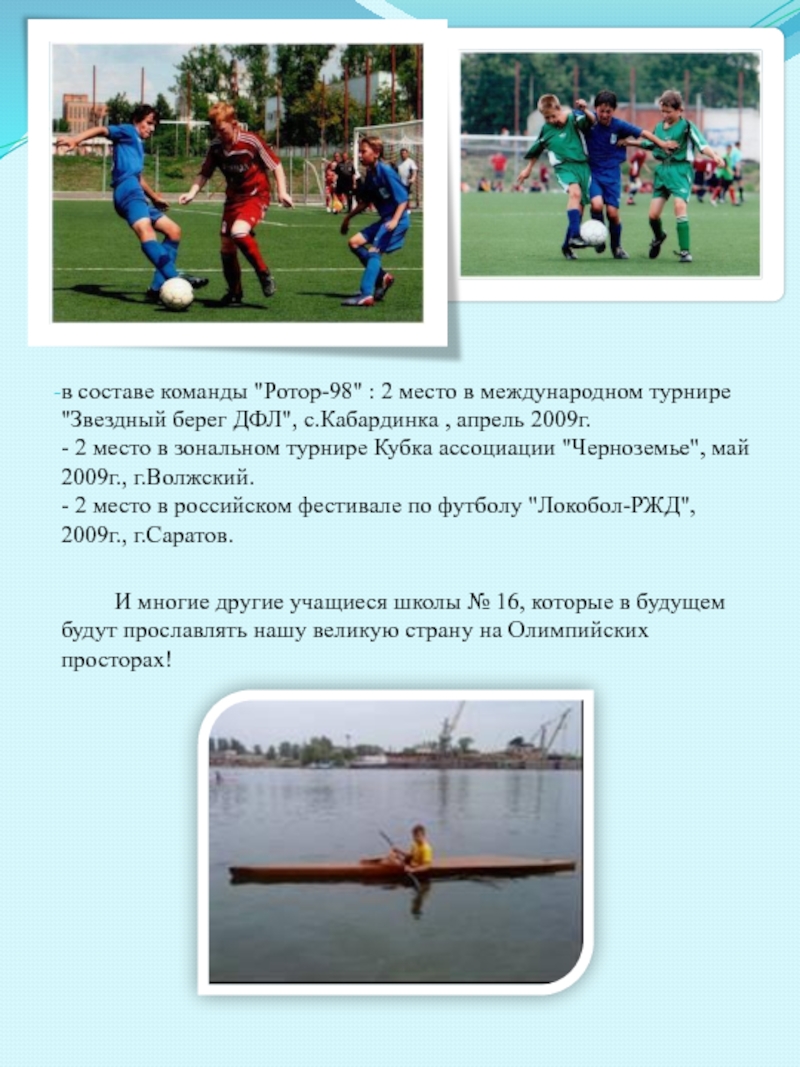 - 2 место на Всероссийских соревнованиях по футболу, сентябрь 2010г. г. Астрахань.