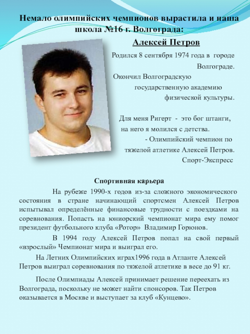 Слайд 7Немало олимпийских чемпионов вырастила и наша школа №16 г. Волгограда: