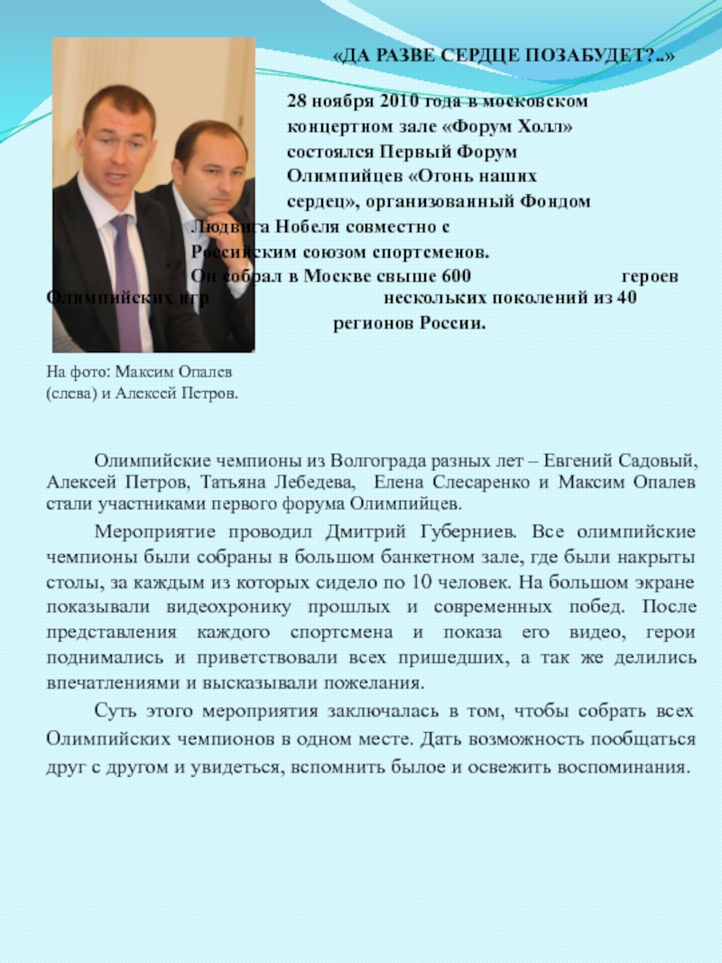 Олимпийские чемпионы из Волгограда разных лет – Евгений Садовый, Алексей Петров, Татьяна Лебедева, Елена Слесаренко и Максим Опалев стали участниками первого форума Олимпийцев.