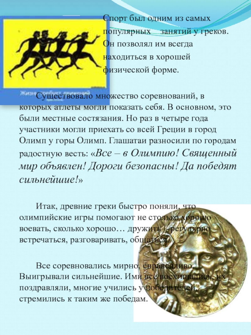 Существовало множество соревнований, в которых атлеты могли показать себя. В основном, это были местные состязания. Но раз в четыре года участники могли приехать со всей Греции в город Олимп у горы Олимп. Глашатаи разносили по городам радостную весть: «Все – в Олимпию! Священный мир объявлен! Дороги безопасны! Да победят сильнейшие!»