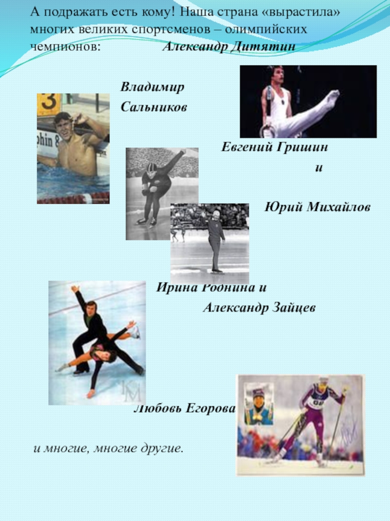 Слайд 5А подражать есть кому! Наша страна «вырастила» многих великих спортсменов –