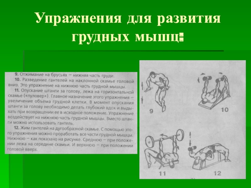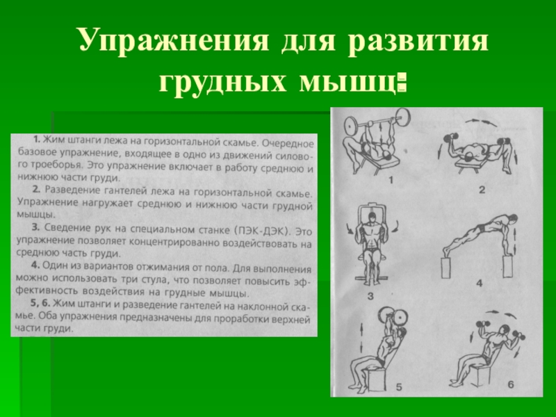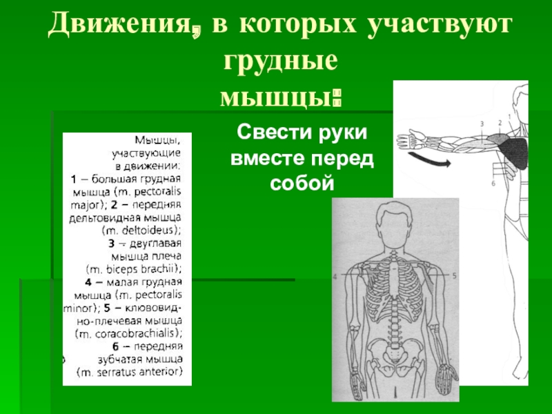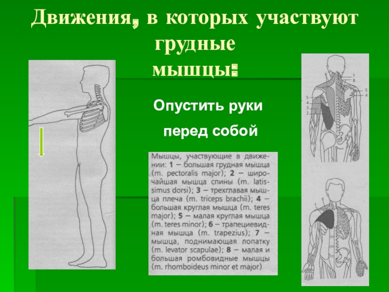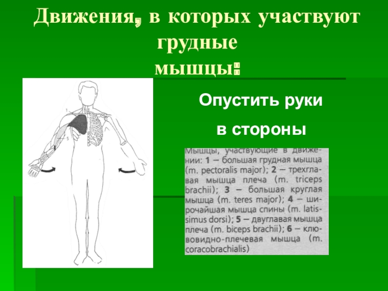 5. Большая грудная мышца. Приводит руки к туловищу. Упражнение: лежа на спине опускание прямых рук в стороны из положения руки вперед.