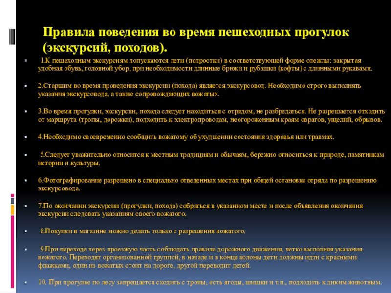 Слайд 10Правила поведения во время пешеходных прогулок (экскурсий, походов).