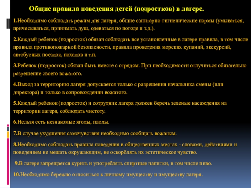 Слайд 2Общие правила поведения детей (подростков) в лагере.