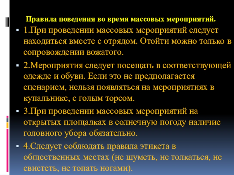 4.Следует соблюдать правила этикета в общественных местах (не шуметь, не толкаться, не свистеть, не топать ногами).