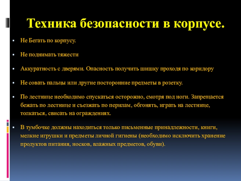 В тумбочке должны находиться только письменные принадлежности, книги, мелкие игрушки и предметы личной гигиены (необходимо исключить хранение продуктов питания, носков, влажных предметов, обуви).