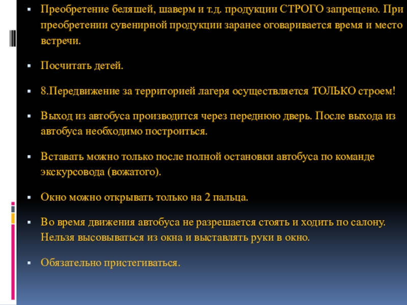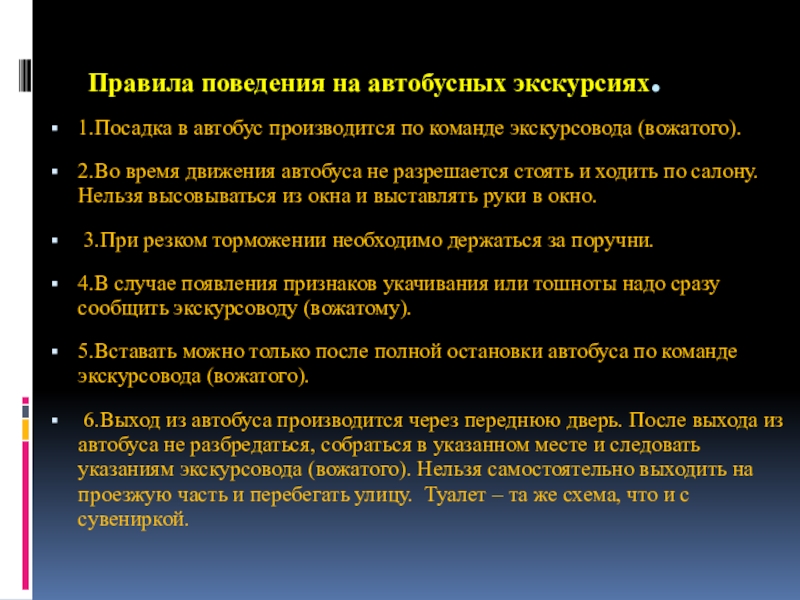 5.Вставать можно только после полной остановки автобуса по команде экскурсовода (вожатого).