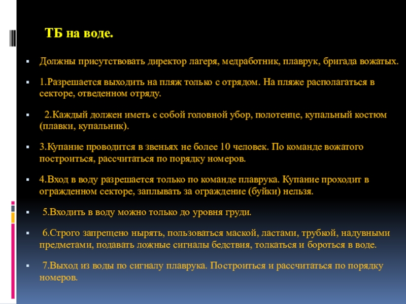 6.Строго запрещено нырять, пользоваться маской, ластами, трубкой, надувными предметами, подавать ложные сигналы бедствия, толкаться и бороться в воде.