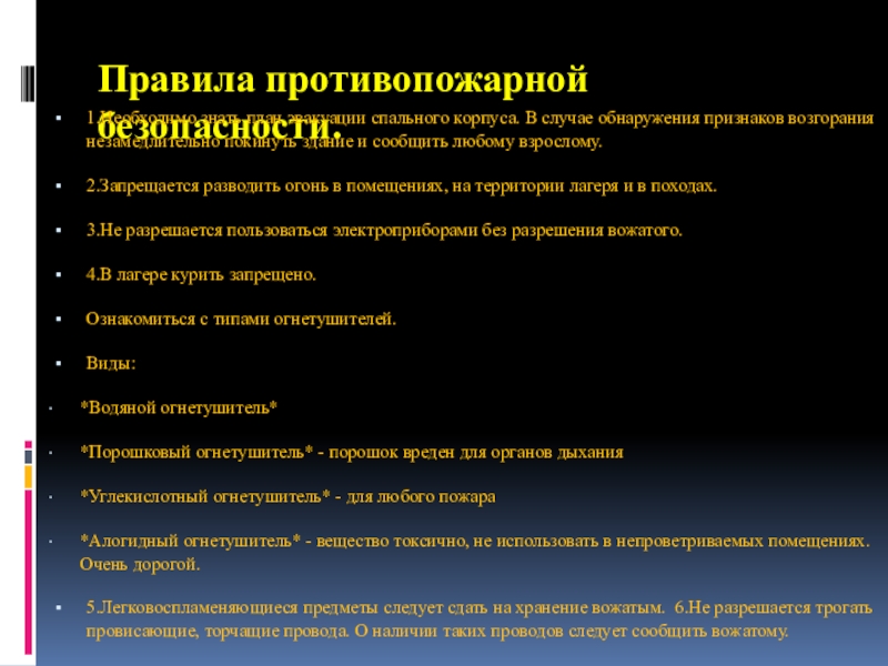 5.Легковоспламеняющиеся предметы следует сдать на хранение вожатым. 6.Не разрешается трогать провисающие, торчащие провода. О наличии таких проводов следует сообщить вожатому.