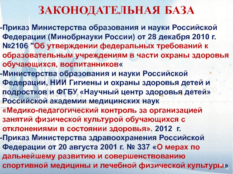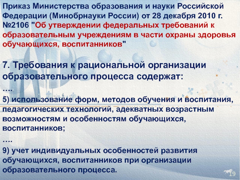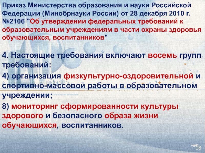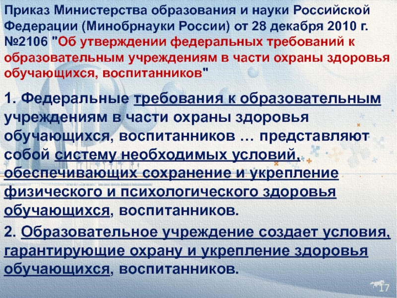 Приказ Министерства образования и науки Российской Федерации (Минобрнауки России) от 28 декабря 2010 г. №2106 "Об утверждении федеральных требований к образовательным учреждениям в части охраны здоровья обучающихся, воспитанников"