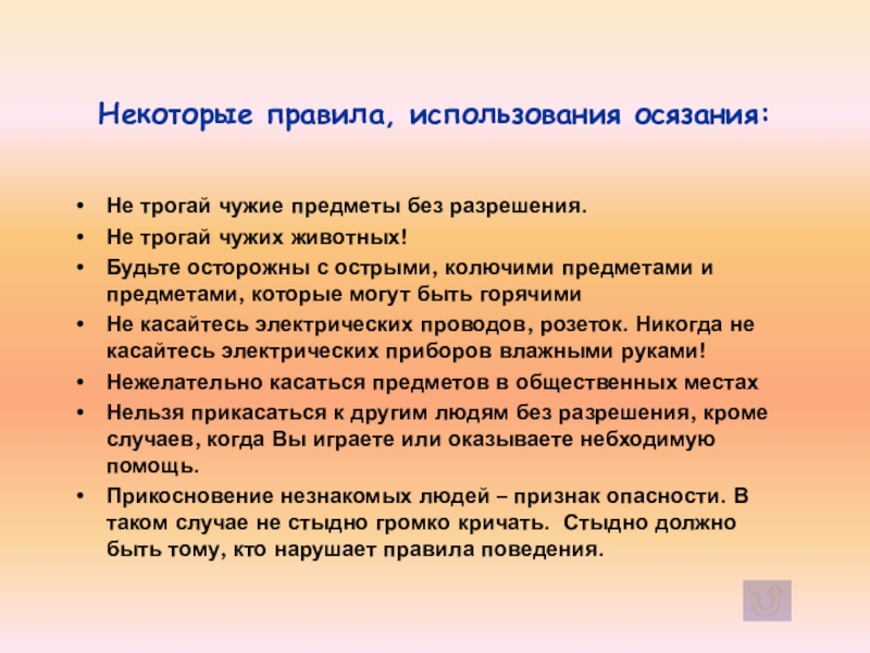 Осязание может заменять другие чувства восприятия, например зрение: (ориентация в темноте, книги для слепых людей). Но не всегда и не все можно трогать руками. Есть специальные правила, которые надо знать.