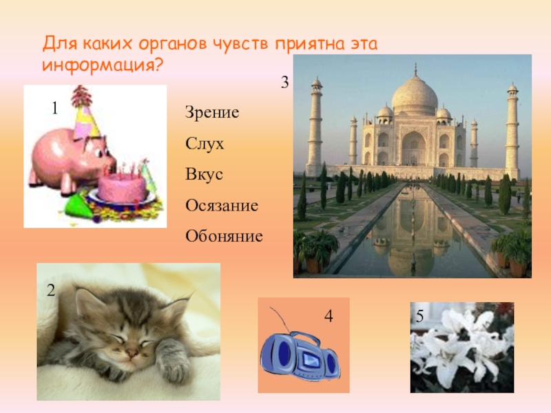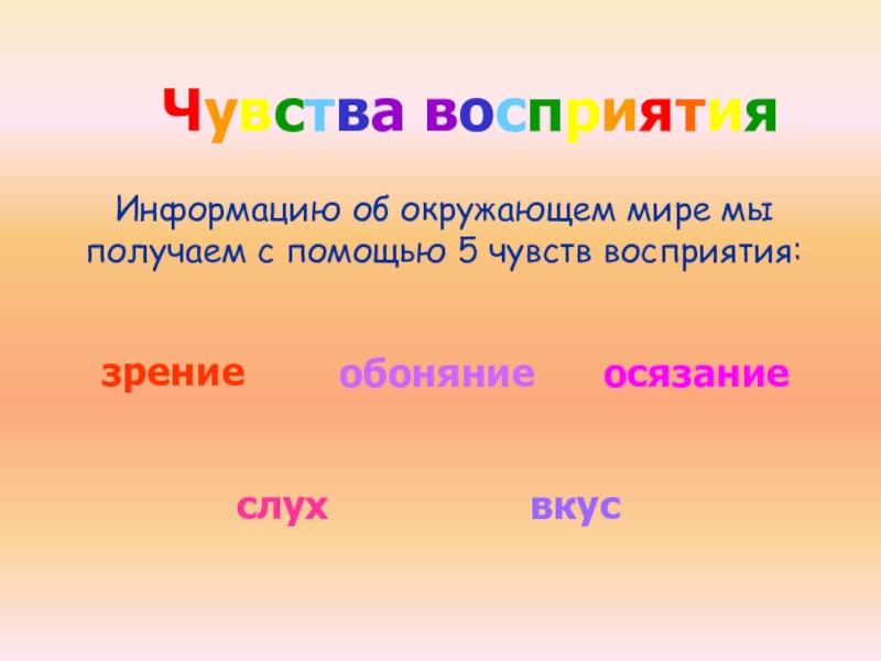 По информативности осязание занимает третье место после зрения и слуха. Это единственное чувство, кроме зрения, которое дает сведения о форме и количестве предметов. В отличие от остальных четырех чувств, которые реализуются через конкретные органы - глаза, уши или рот, - осязательные ощущения воспринимаются по всему телу. Осязание дает информацию только при касании.
