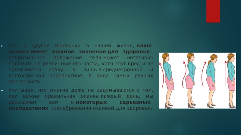 Слайд 4Как и другие привычки в нашей жизни, наша осанка имеет важное значение для здоровья;