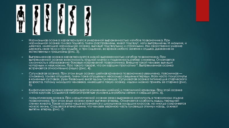 Слайд 7Нормальная осанка характеризуется умеренной выраженностью изгибов позвоночника. При нормальной осанке голова