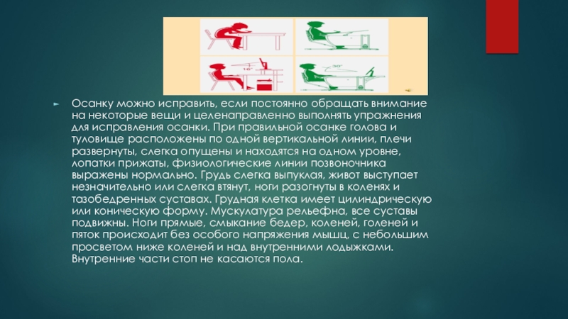 Слайд 5Осанку можно исправить, если постоянно обращать внимание на некоторые вещи и