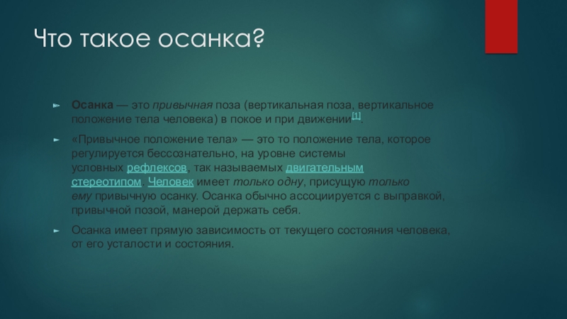 «Привычное положение тела» — это то положение тела, которое регулируется бессознательно, на уровне системы условных рефлексов, так называемых двигательным стереотипом. Человек имеет только одну, присущую только ему привычную осанку. Осанка обычно ассоциируется с выправкой, привычной позой, манерой держать себя.