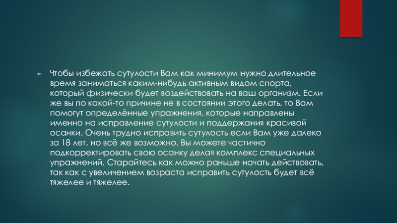 Слайд 6Чтобы избежать сутулости Вам как минимум нужно длительное время заниматься каким-нибудь