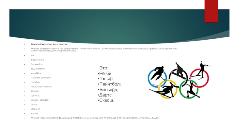 зимних Олимпийских играх. Ежегодно список расширяется. В последние годы олимпийскими видами спорта считались: