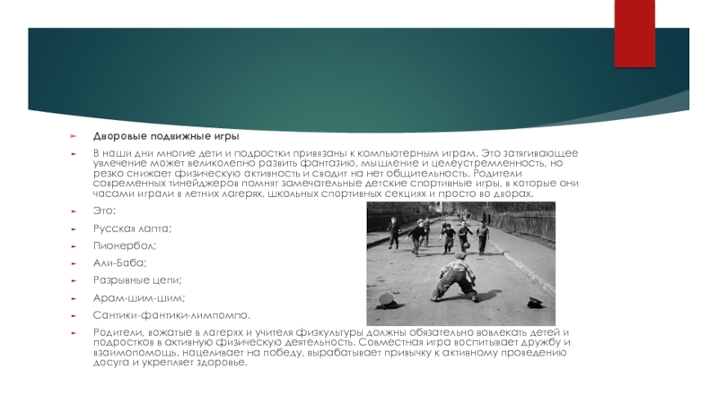 компьютерным играм. Это затягивающее увлечение может великолепно развить фантазию, мышление и целеустремленность, но резко снижает физическую активность и сводит на нет общительность. Родители современных тинейджеров помнят замечательные детские спортивные игры, в которые они часами играли в летних лагерях, школьных спортивных секциях и просто во дворах.