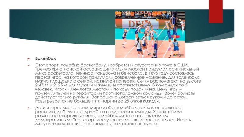ассоциации Уильям Морган придумал оригинальный микс баскетбола, тенниса, гандбола и бейсбола. В 1895 году состоялась первая игра, на которой придумали современное название. Для волейбола нужна площадка с сеткой, натянутой поперек. Сетку располагают на высоте 2,43 м и 2, 25 м для мужчин и женщин соответственно. В командах по 5 человек. Игроки меняются местами по ходу подач мяча. Цель игры – приземлить мяч на территории противоположной команды. Волейболисты действуют только руками. Запрещено дотрагиваться руками до сетки. Разыгрывается не больше пяти партий до 25 очков каждая.