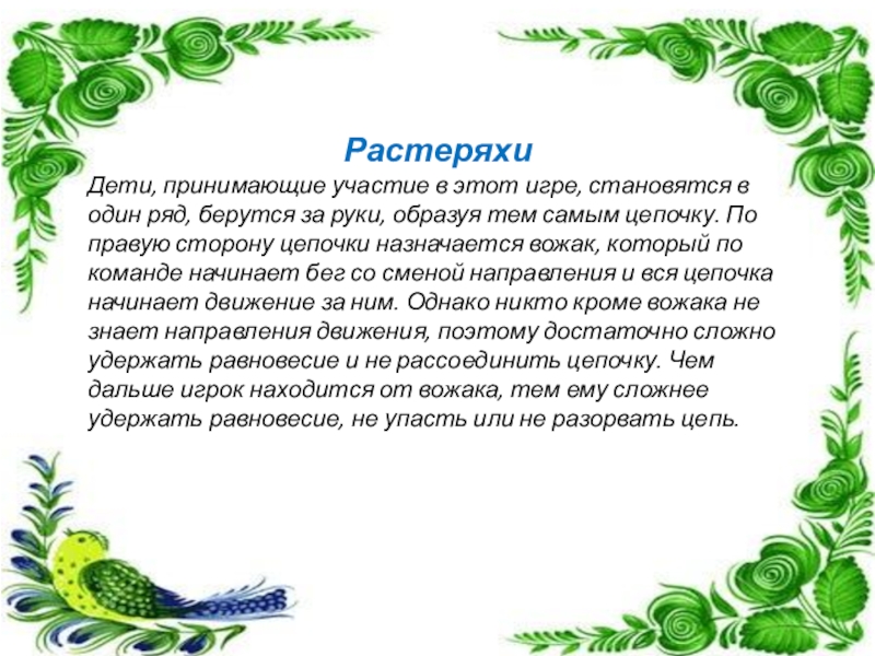 Русские народные игры имеют многотысячелетнюю историю: они сохранились до наших дней со времен глубокой старины, передавались из поколения в поколение, вбирая в себя лучшие национальные традиции.