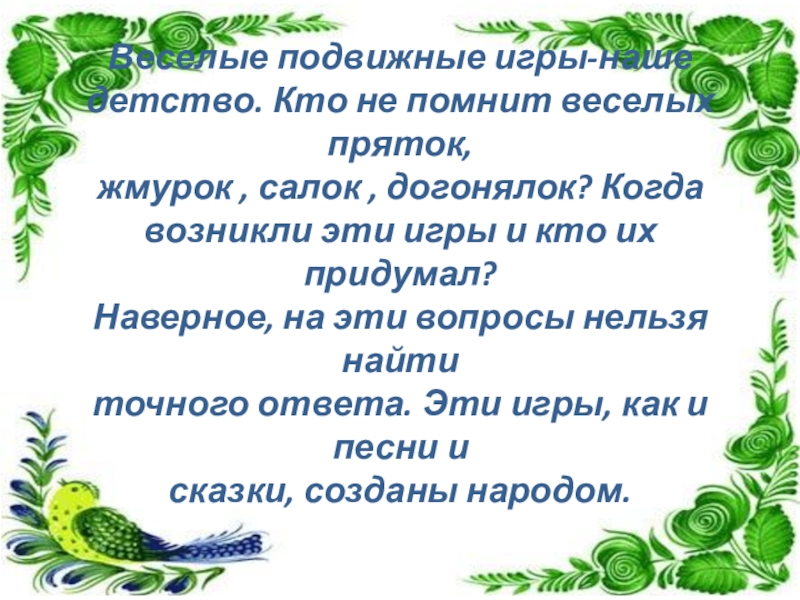 В детском быту есть свои традиции. Одна из них - это заимствование игр детьми друг от друга, младшего поколения от более старшего. Кто придумал эти игры («Гуси-лебеди», «Коршун и цыплята».? Когда они возникли? Вероятно, они созданы народом так же, как песни, сказки, поговорки и т.п. По этому признаку они и называются – народными.