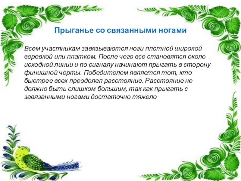 платком. После чего все становятся около исходной линии и по сигналу начинают прыгать в сторону финишной черты. Победителем является тот, кто быстрее всех преодолел расстояние. Расстояние не должно быть слишком большим, так как прыгать с завязанными ногами достаточно тяжело
