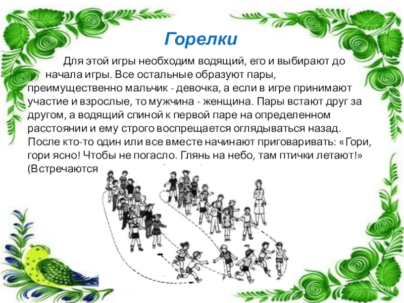 начала игры. Все остальные образуют пары, преимущественно мальчик - девочка, а если в игре принимают участие и взрослые, то мужчина - женщина. Пары встают друг за другом, а водящий спиной к первой паре на определенном расстоянии и ему строго воспрещается оглядываться назад. После кто-то один или все вместе начинают приговаривать: «Гори, гори ясно! Чтобы не погасло. Глянь на небо, там птички летают!» (Встречаются и другие рифмовки).
