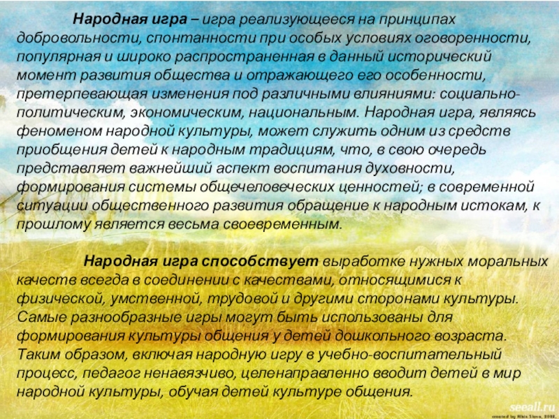 игра реализующееся на принципах добровольности, спонтанности при особых условиях оговоренности, популярная и широко распространенная в данный исторический момент развития общества и отражающего его особенности, претерпевающая изменения под различными влияниями: социально-политическим, экономическим, национальным. Народная игра, являясь феноменом народной культуры, может служить одним из средств приобщения детей к народным традициям, что, в свою очередь представляет важнейший аспект воспитания духовности, формирования системы общечеловеческих ценностей; в современной ситуации общественного развития обращение к народным истокам, к прошлому является весьма своевременным.