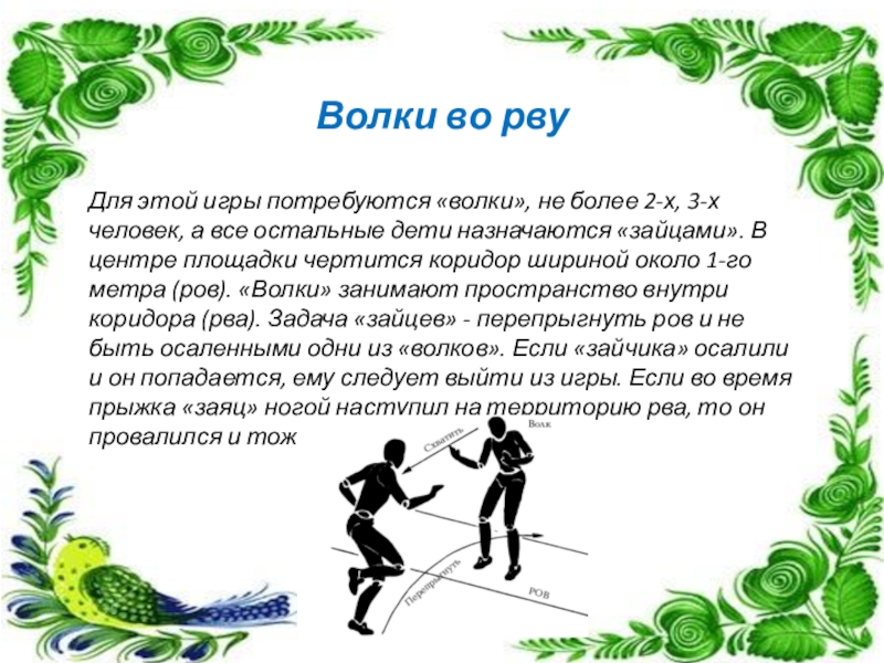 человек, а все остальные дети назначаются «зайцами». В центре площадки чертится коридор шириной около 1-го метра (ров). «Волки» занимают пространство внутри коридора (рва). Задача «зайцев» - перепрыгнуть ров и не быть осаленными одни из «волков». Если «зайчика» осалили и он попадается, ему следует выйти из игры. Если во время прыжка «заяц» ногой наступил на территорию рва, то он провалился и тоже выходит из игры.