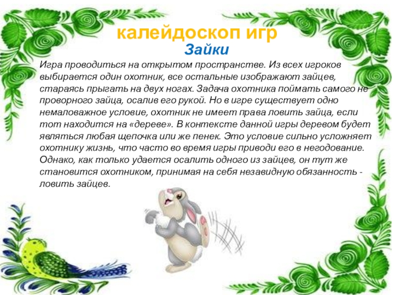 охотник, все остальные изображают зайцев, стараясь прыгать на двух ногах. Задача охотника поймать самого не проворного зайца, осалив его рукой. Но в игре существует одно немаловажное условие, охотник не имеет права ловить зайца, если тот находится на «дереве». В контексте данной игры деревом будет являться любая щепочка или же пенек. Это условие сильно усложняет охотнику жизнь, что часто во время игры приводи его в негодование. Однако, как только удается осалить одного из зайцев, он тут же становится охотником, принимая на себя незавидную обязанность - ловить зайцев.