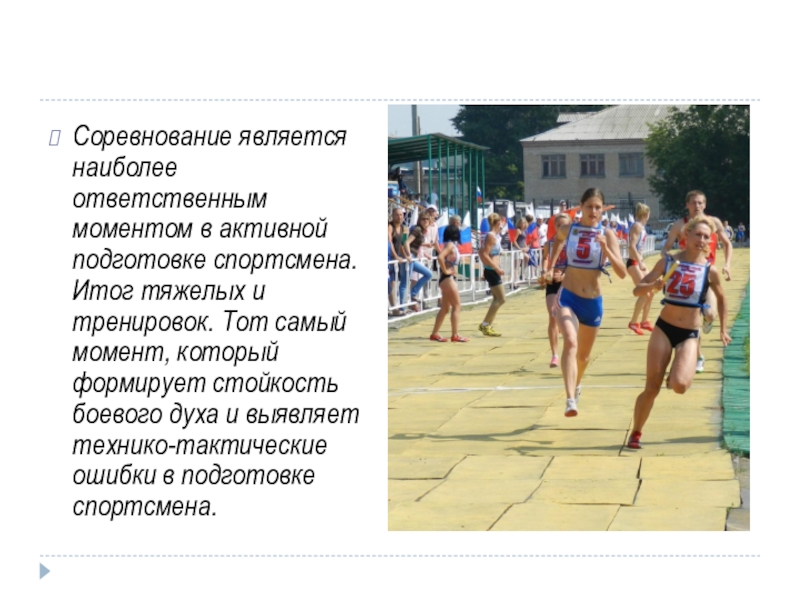 Слайд 10Соревнование является наиболее ответственным моментом в активной подготовке спортсмена. Итог тяжелых