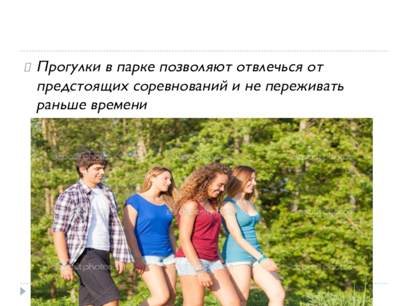 Слайд 18Прогулки в парке позволяют отвлечься от предстоящих соревнований и не переживать