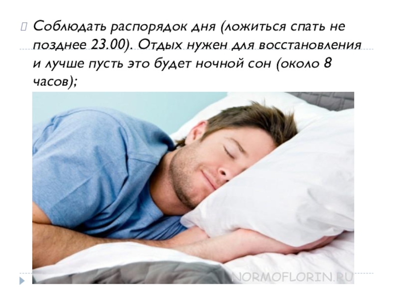 Слайд 17Соблюдать распорядок дня (ложиться спать не позднее 23.00). Отдых нужен для восстановления и