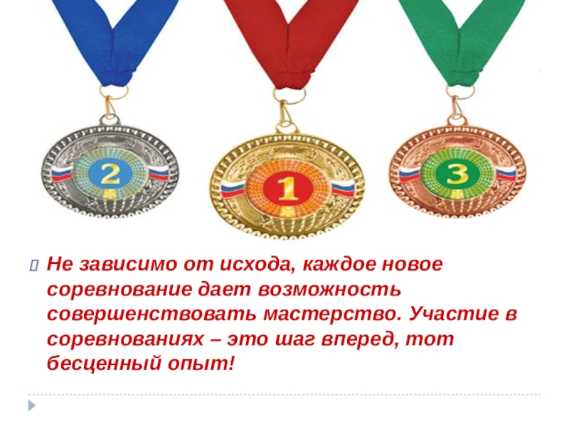 Слайд 21Не зависимо от исхода, каждое новое соревнование дает возможность совершенствовать мастерство.