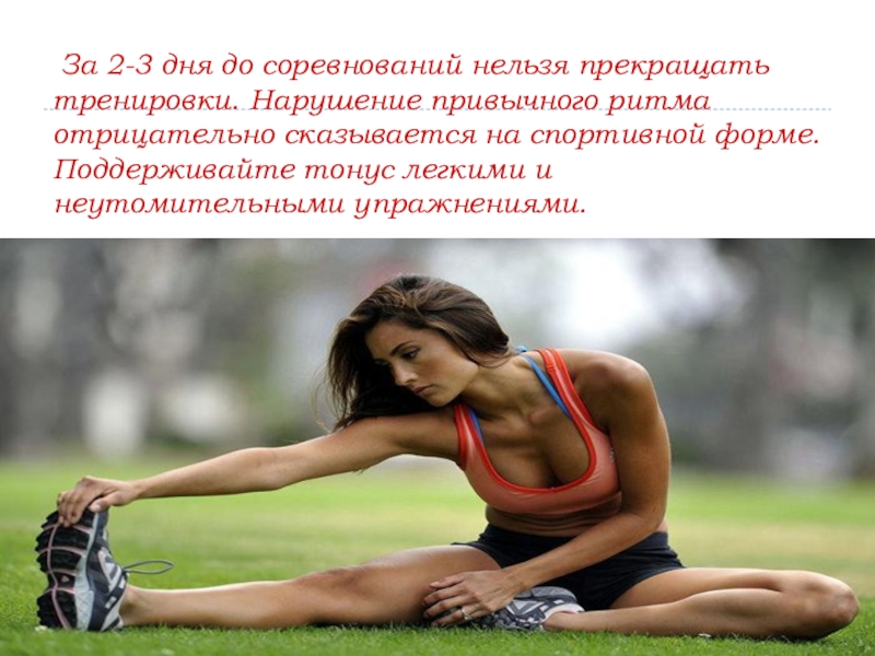 Слайд 12 За 2-3 дня до соревнований нельзя прекращать тренировки. Нарушение привычного