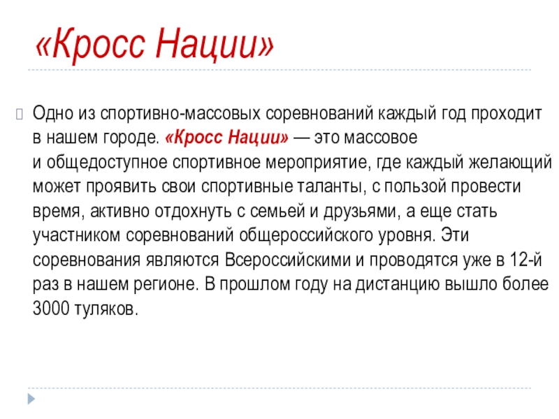 «Кросс Нации»Одно из спортивно-массовых соревнований каждый год проходит в нашем городе. «Кросс Нации» — это массовое и общедоступное спортивное