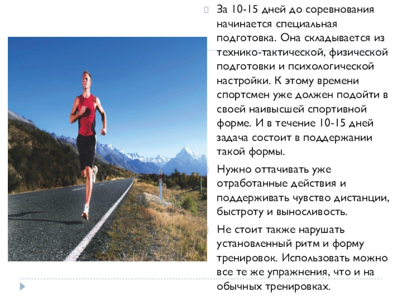 Слайд 11За 10-15 дней до соревнования начинается специальная подготовка. Она складывается из