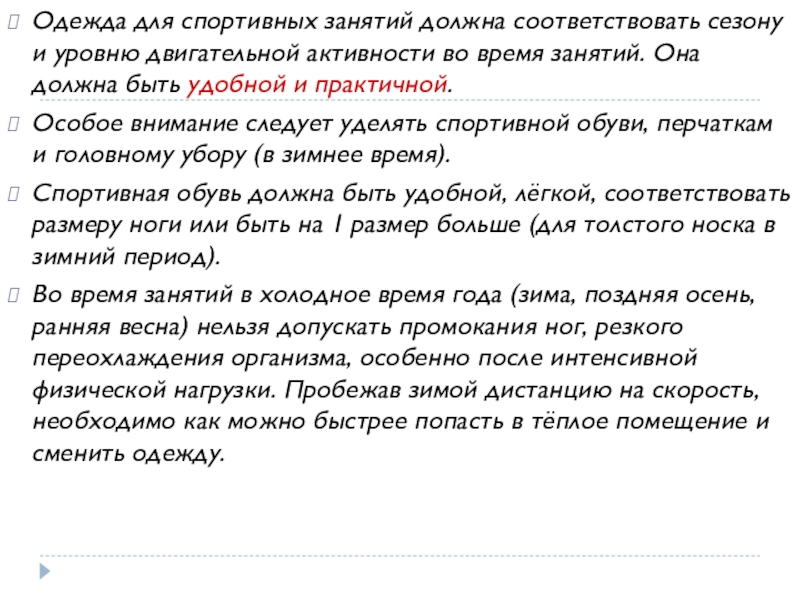 Слайд 13Одежда для спортивных занятий должна соответствовать сезону и уровню двигательной активности