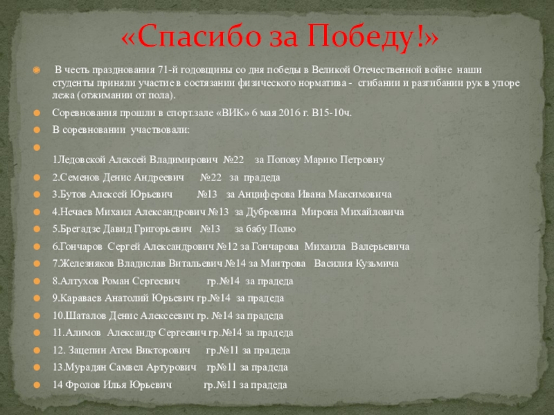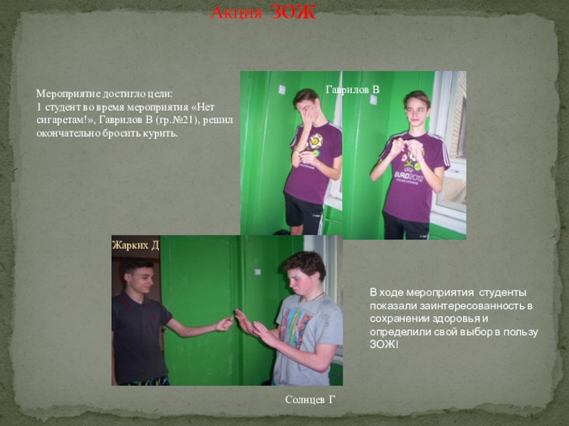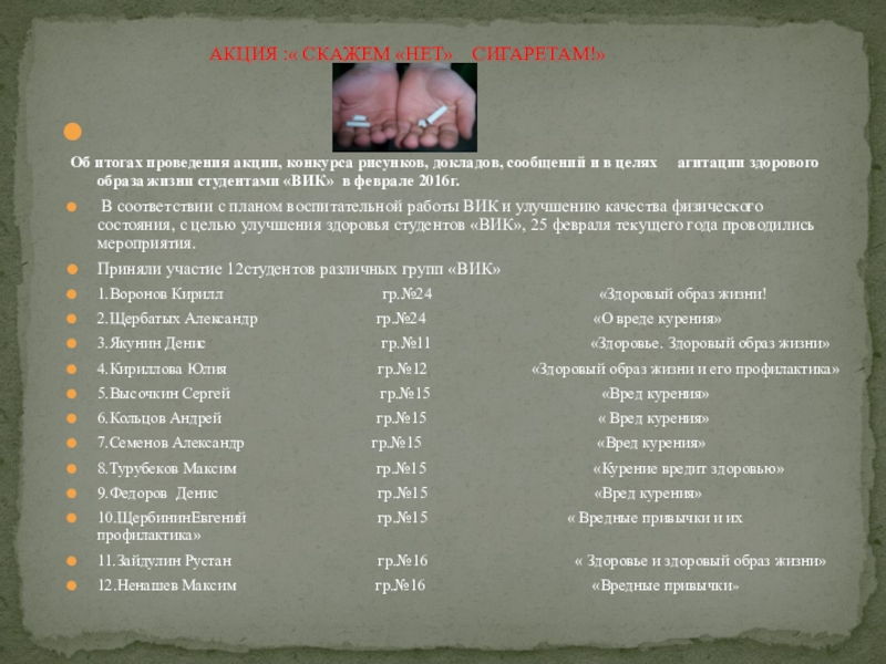 1 студент во время мероприятия «Нет сигаретам!», Гаврилов В (гр.№21), решил окончательно бросить курить.