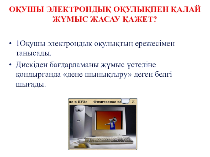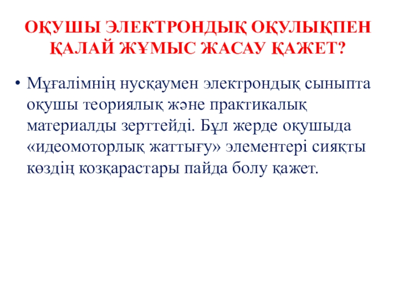 Слайд 23ОҚУШЫ ЭЛЕКТРОНДЫҚ ОҚУЛЫҚПЕН ҚАЛАЙ ЖҰМЫС ЖАСАУ ҚАЖЕТ?