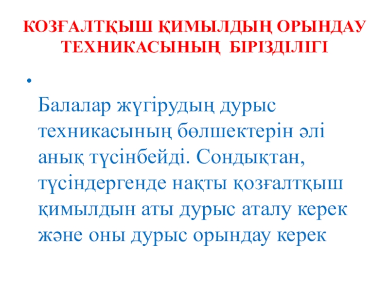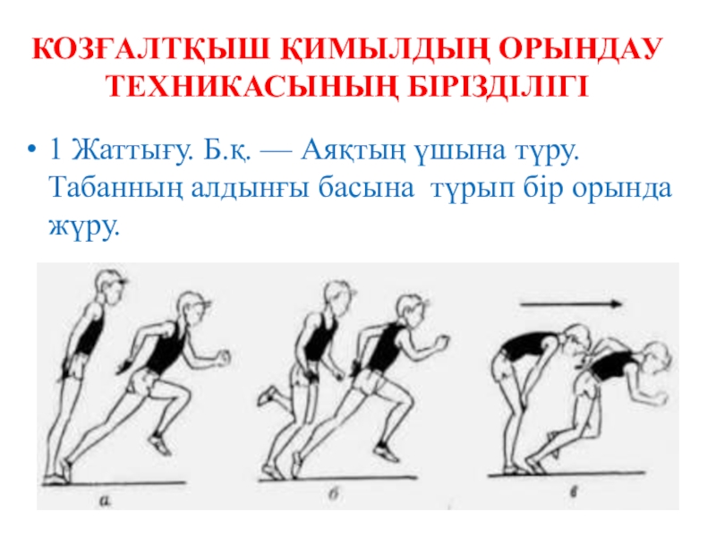 Слайд 14КОЗҒАЛТҚЫШ ҚИМЫЛДЫҢ ОРЫНДАУ ТЕХНИКАСЫНЫҢ БІРІЗДІЛІГІ