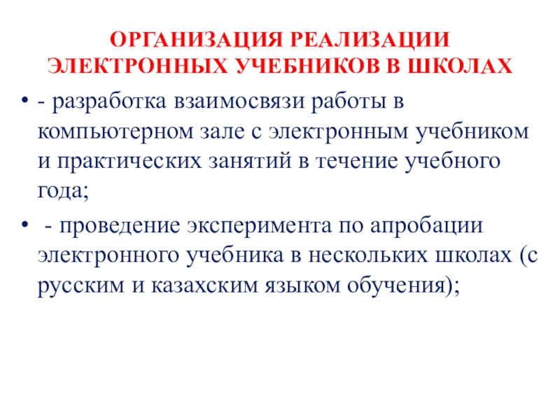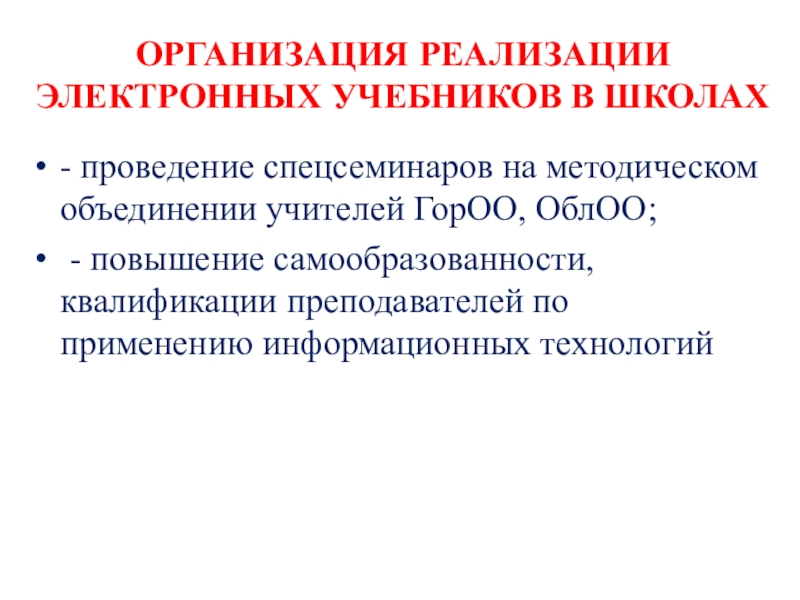 Слайд 31ОРГАНИЗАЦИЯ РЕАЛИЗАЦИИ ЭЛЕКТРОННЫХ УЧЕБНИКОВ В ШКОЛАХ