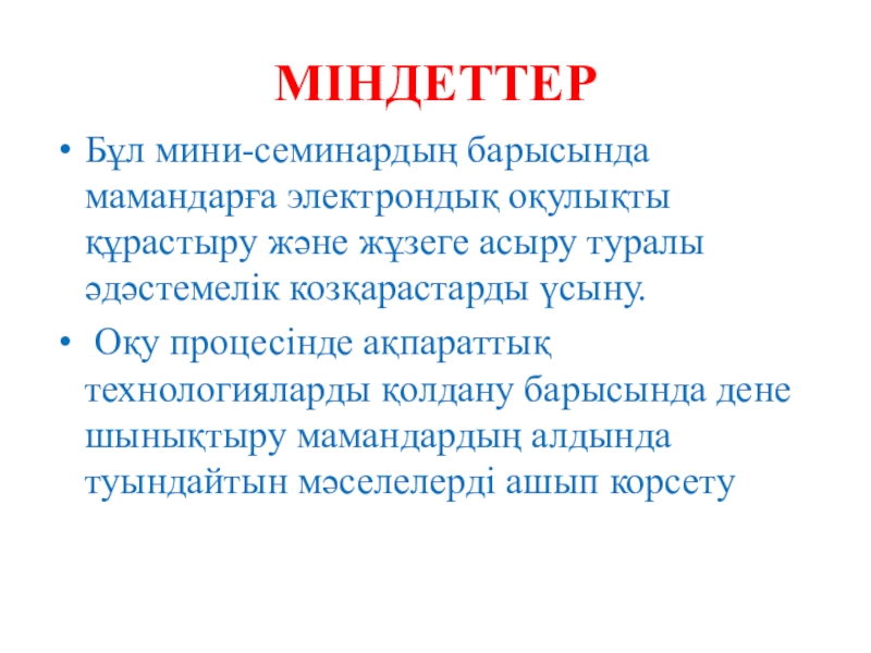 Бұл мини-семинардың барысында мамандарға электрондық оқулықты құрастыру және жұзеге асыру туралы