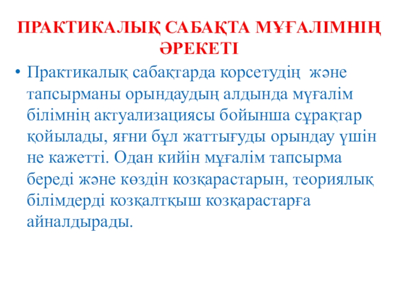 Слайд 16ПРАКТИКАЛЫҚ САБАҚТА МҰҒАЛІМНІҢ ӘРЕКЕТІ